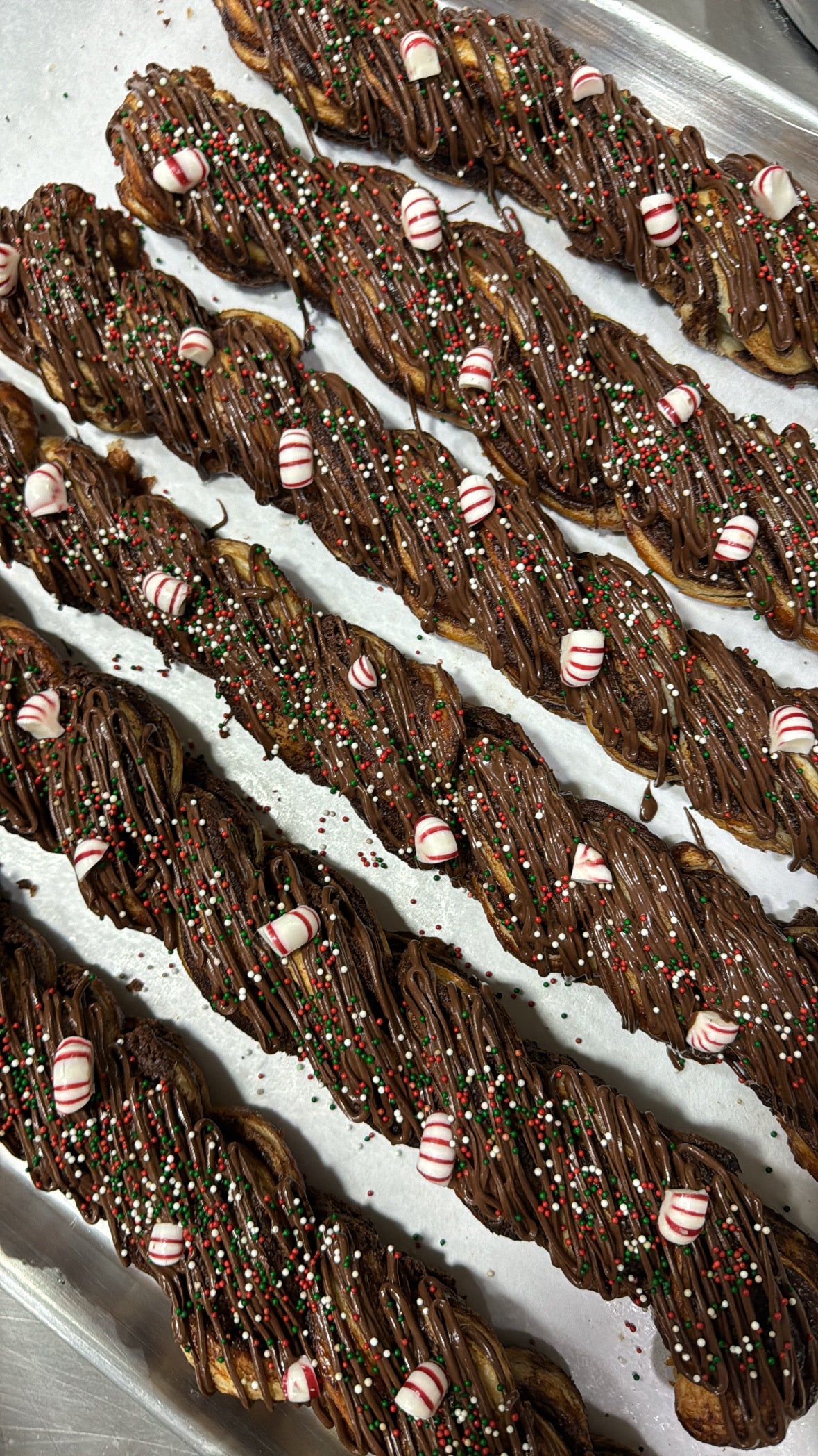 La decoración navideña incluye perlas rojas y verdes con mentas.
