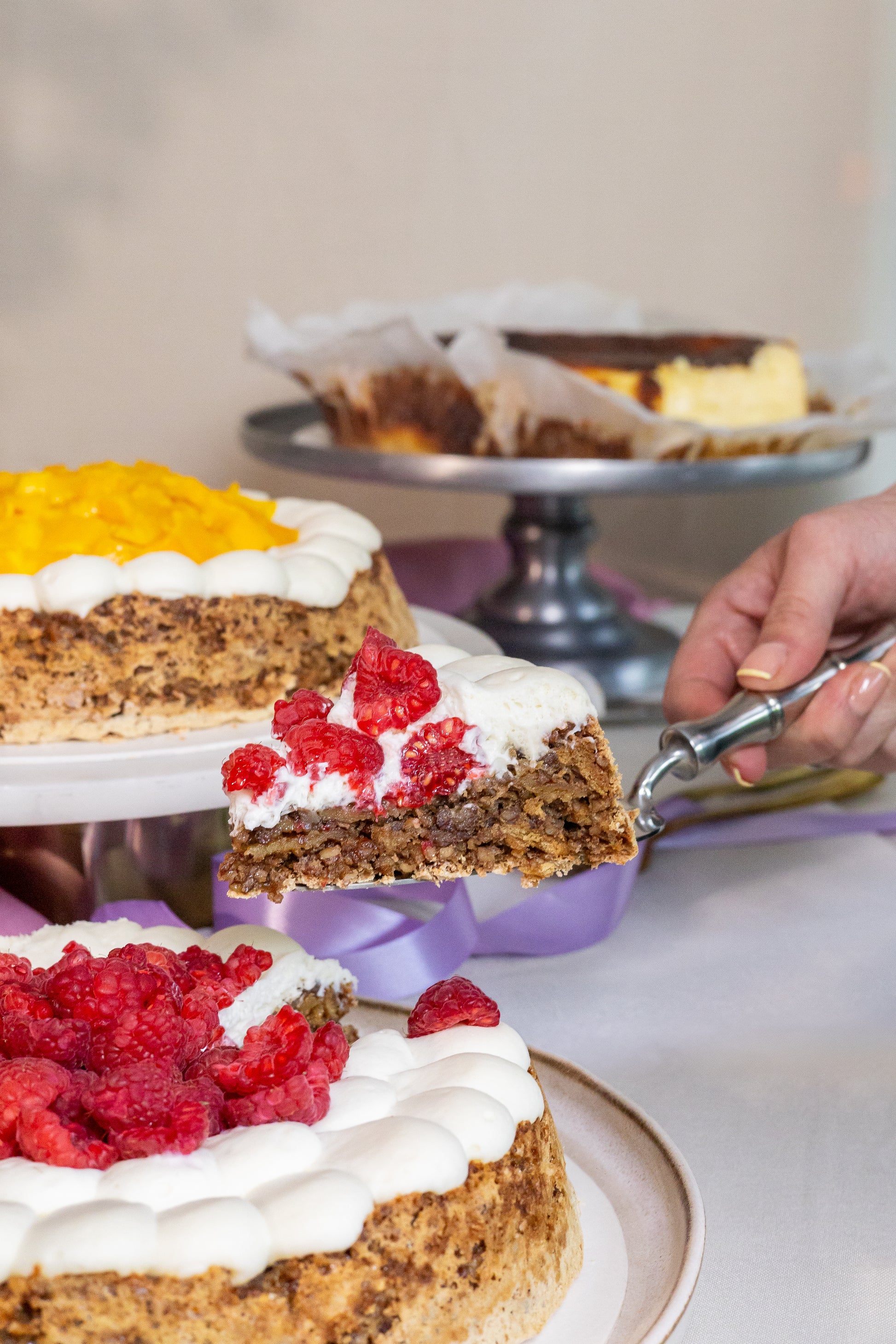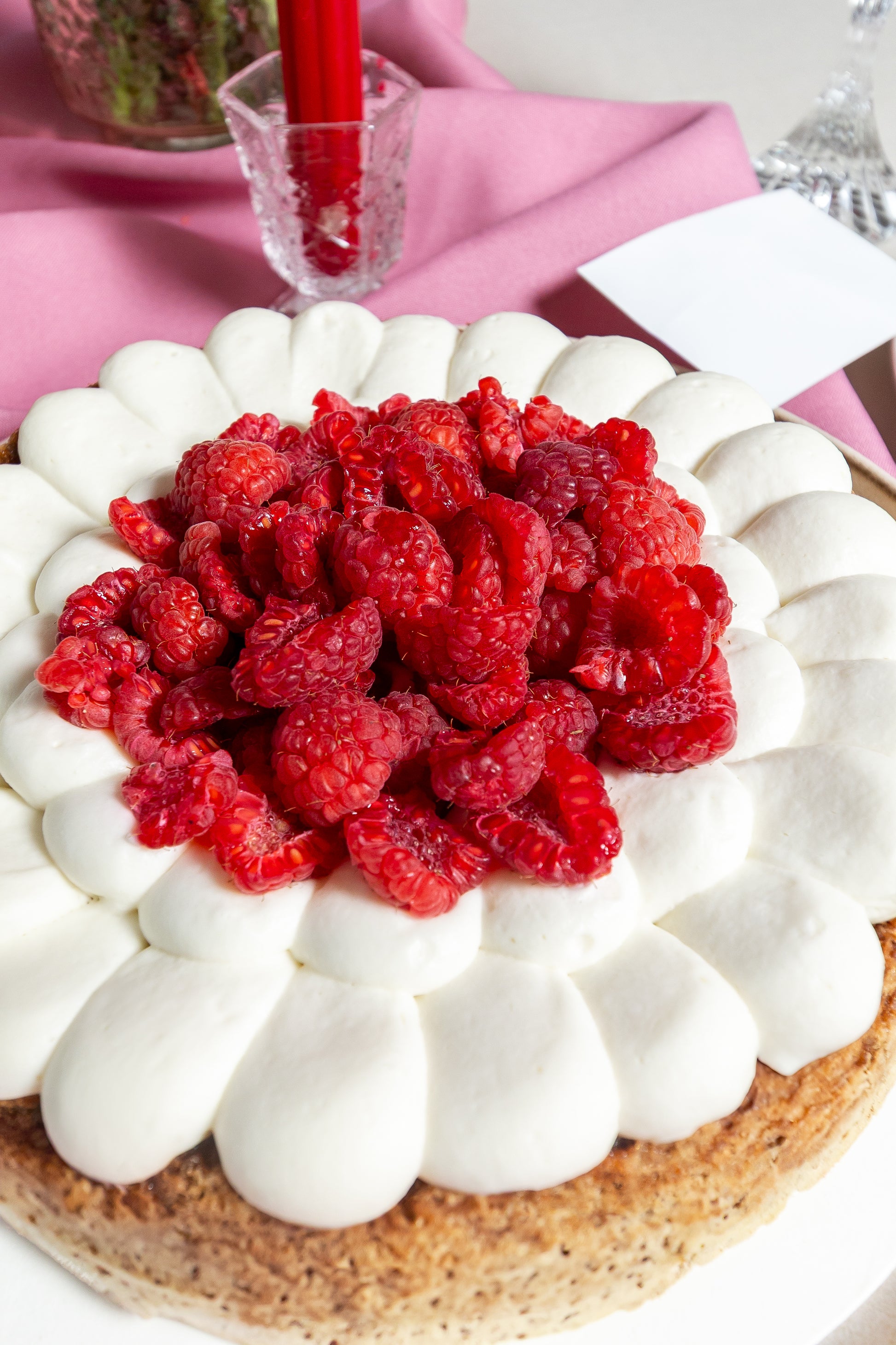 Crujiente de nuez y merengue, crema batida y frambuesas.