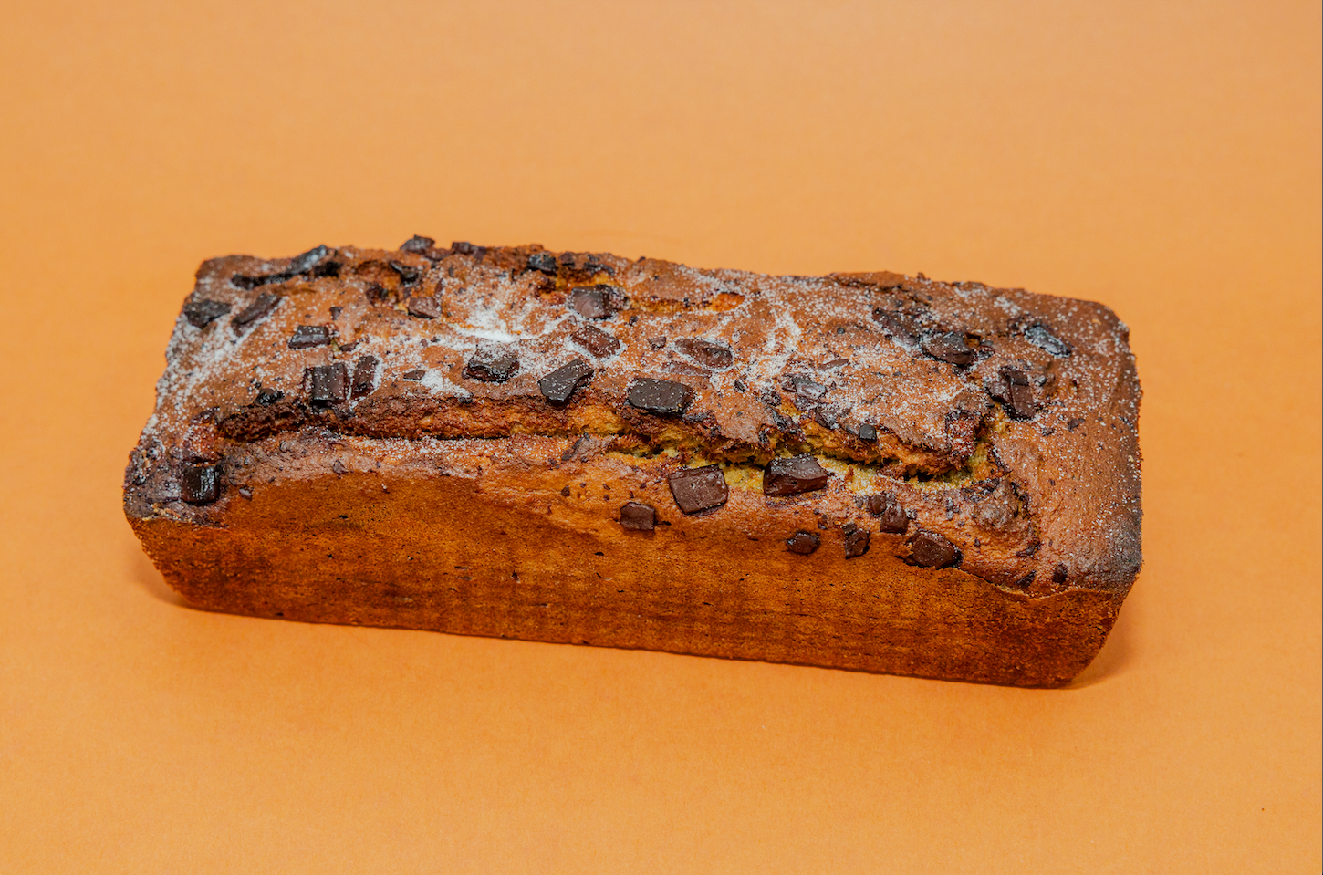 Panqué húmedo de plátanao sin gluten y azúcar. Hecho con harina de almendra, harina de avena, chocolate sin azúcar y endulzado con monk fruit.