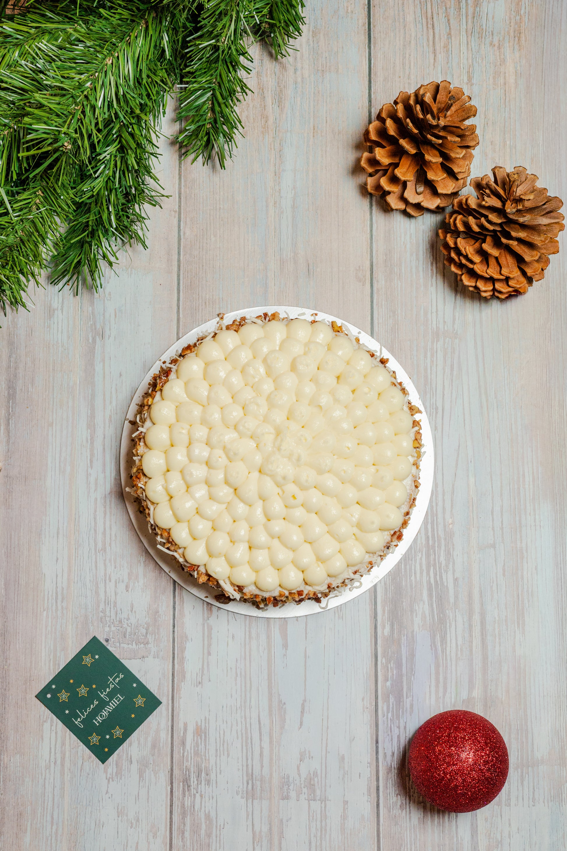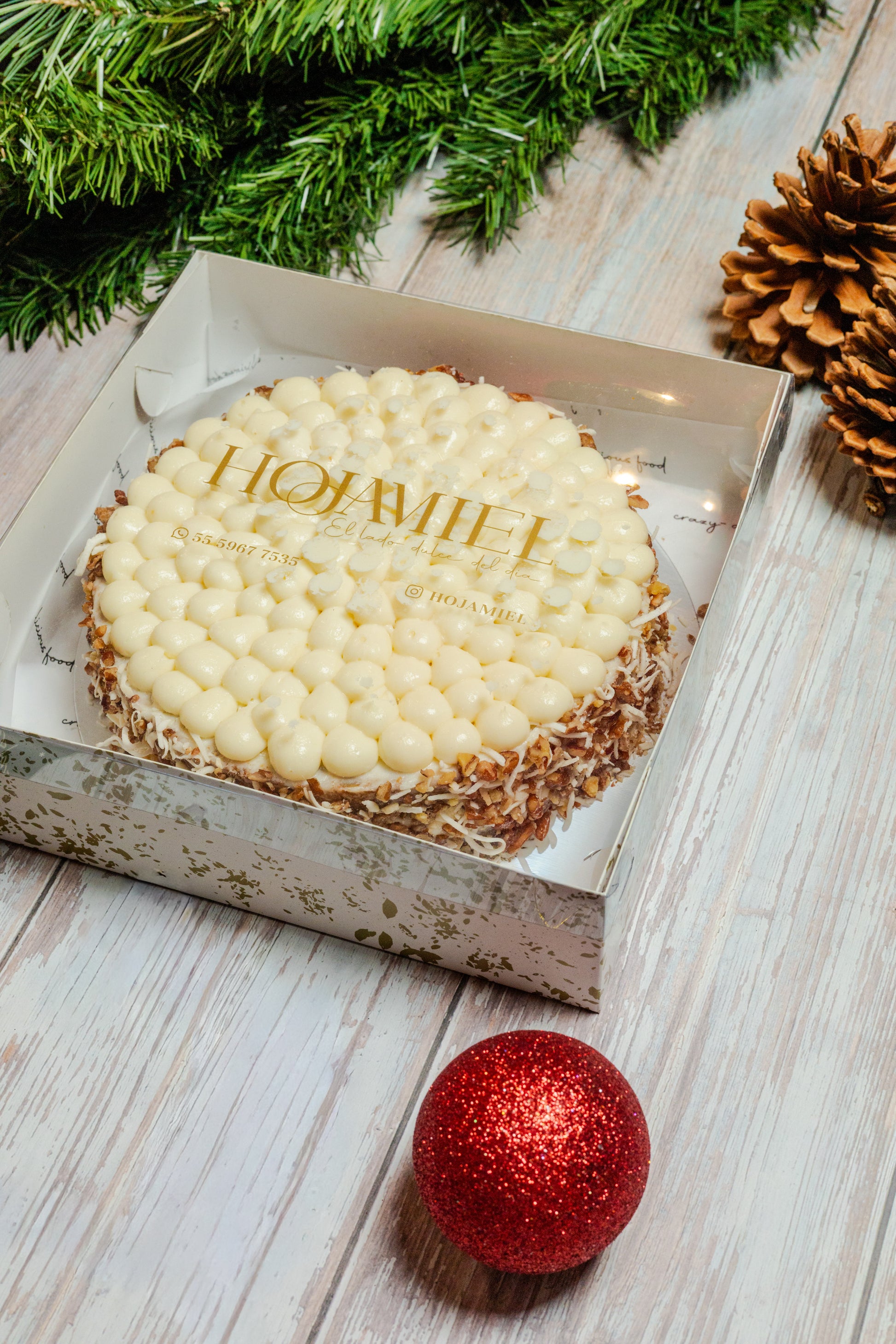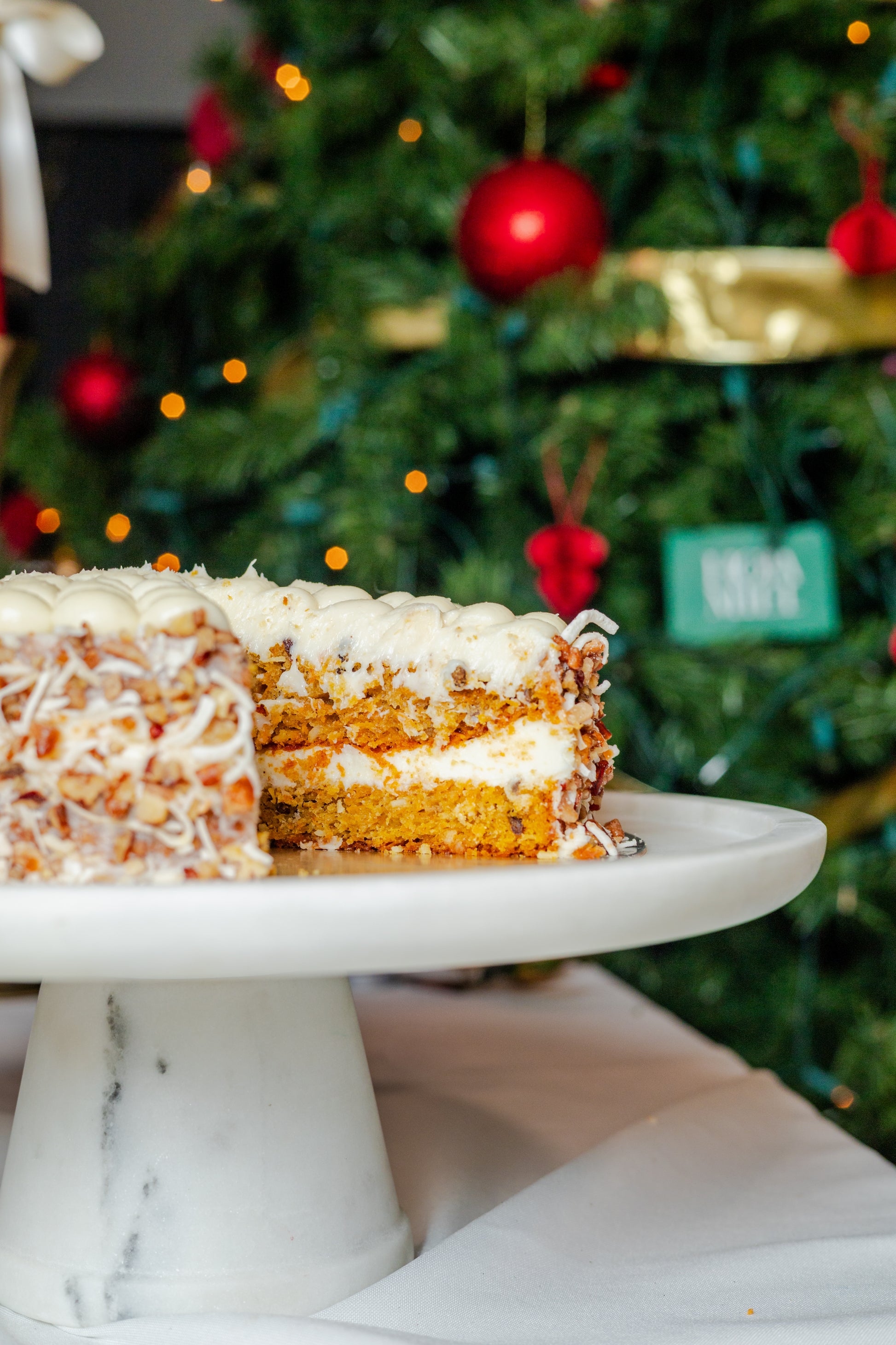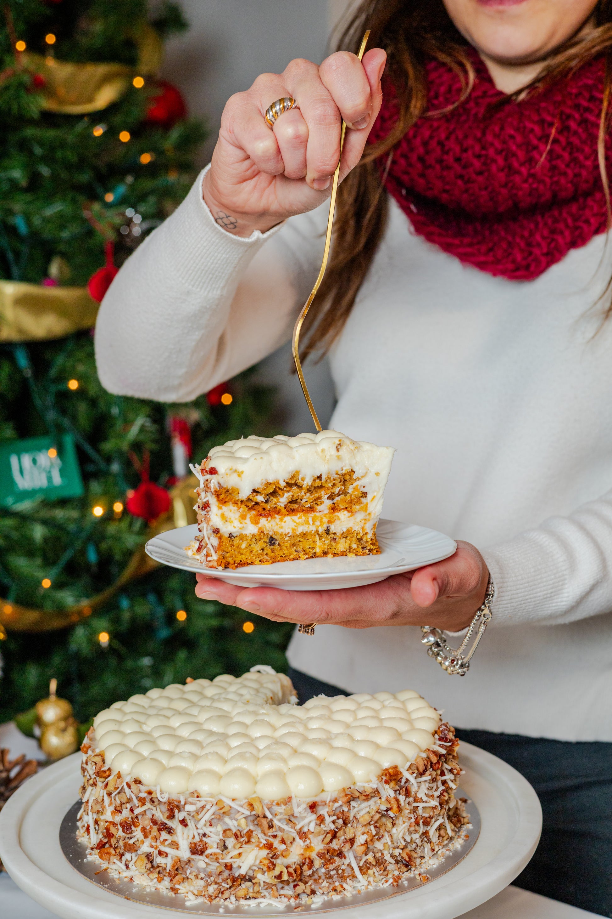 Pastel de zanahoria con betún de queso crema, coco, nuez pecana y nuez caramelizada.