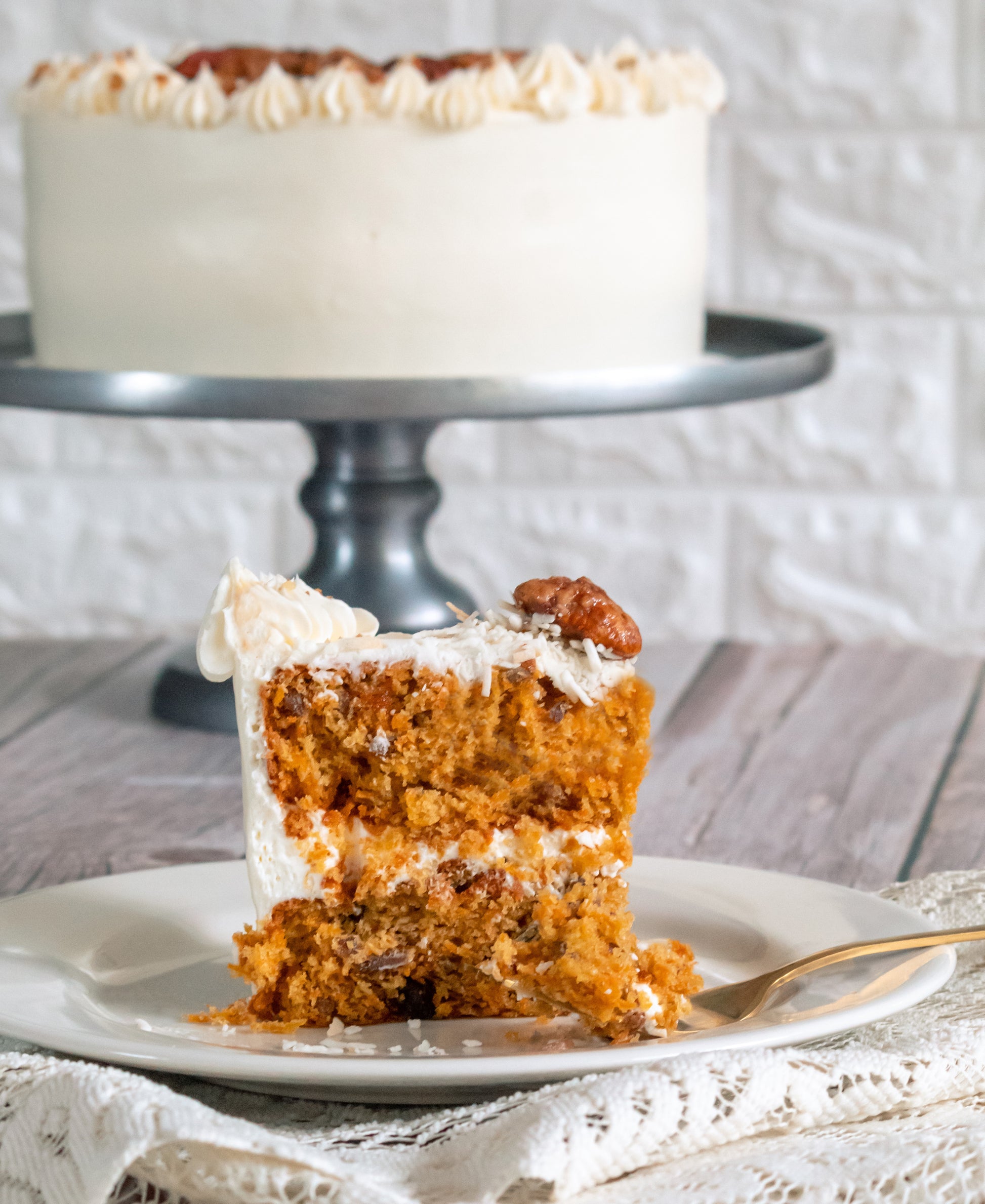 Coco, nuez pecana, nuez caramelizada y betún de queso crema.