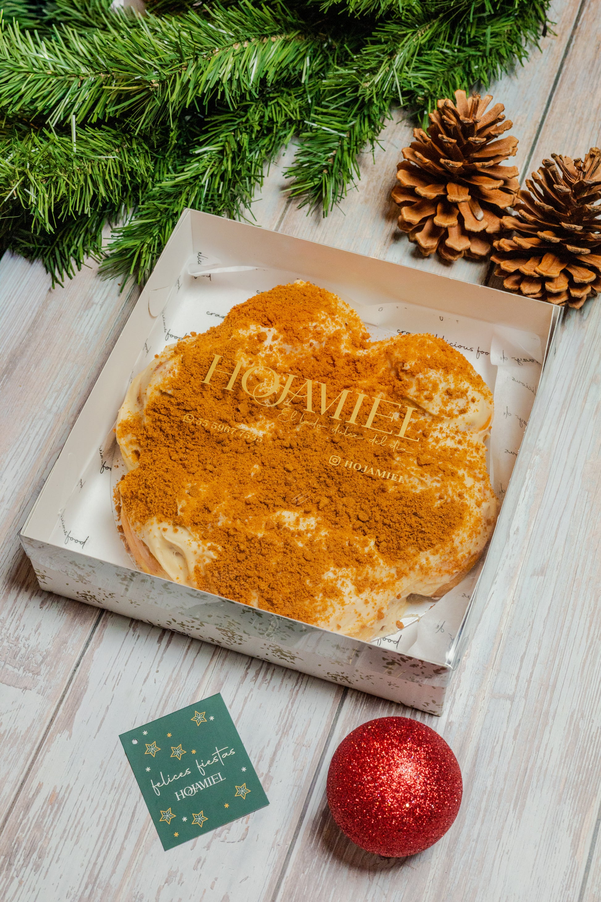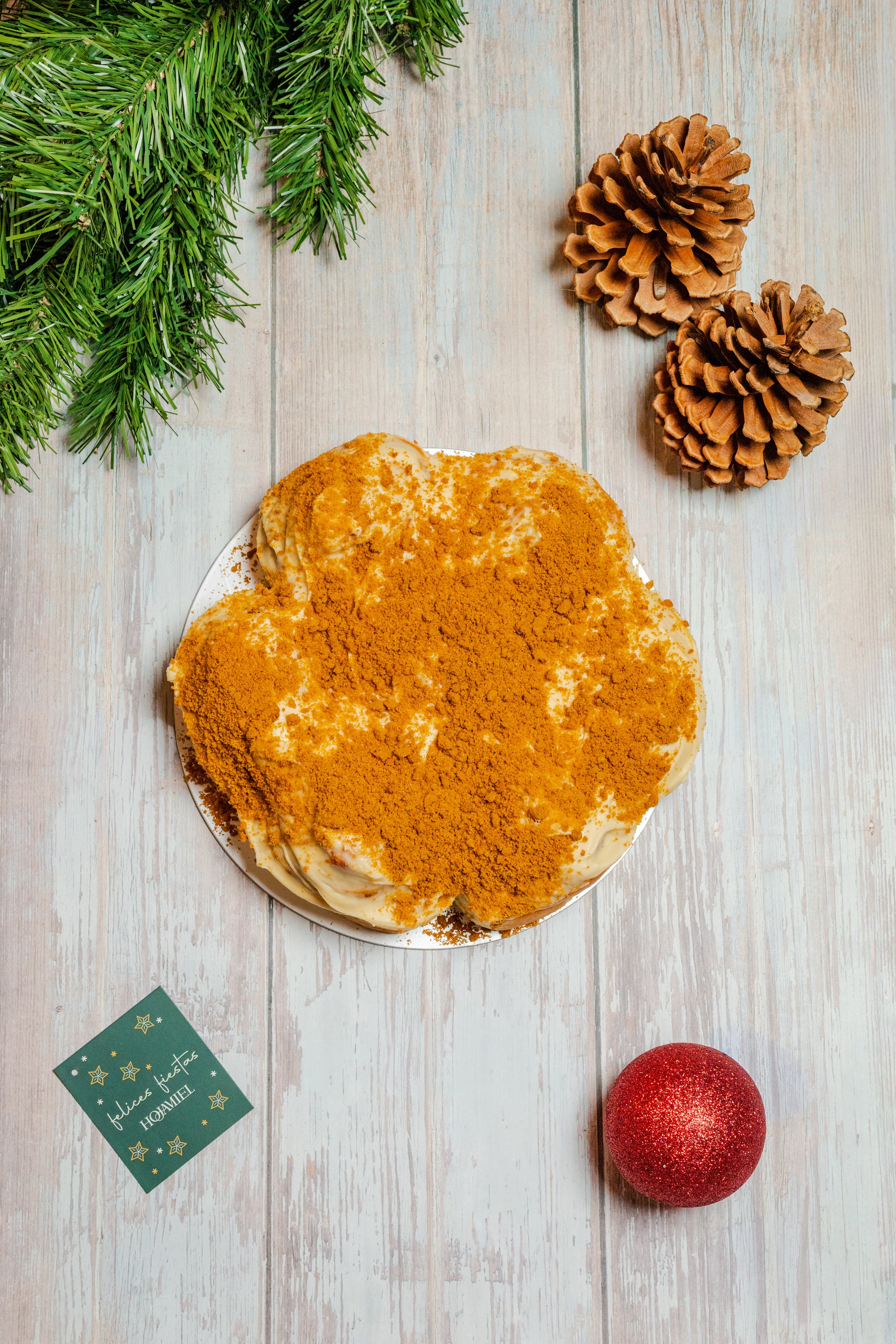 Masa suave rellena de crema y galleta lotus, cubierta de glaseado cremoso de queso crema con lotus y decorada con galleta lotus.