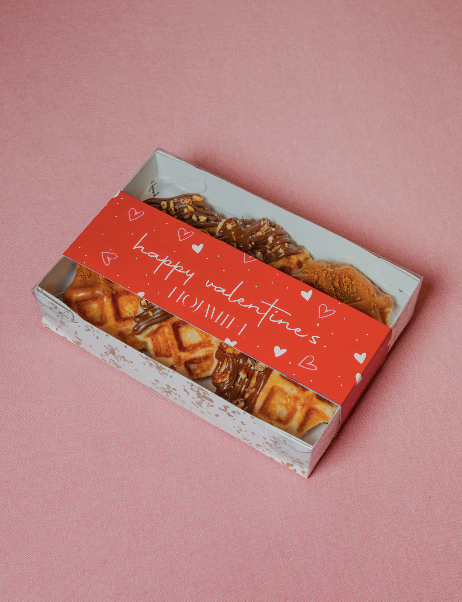 Waffles belga decorados con dulce de leche con nuez caramelizada, nutella con avellana en polvo y crema de galleta lotus.